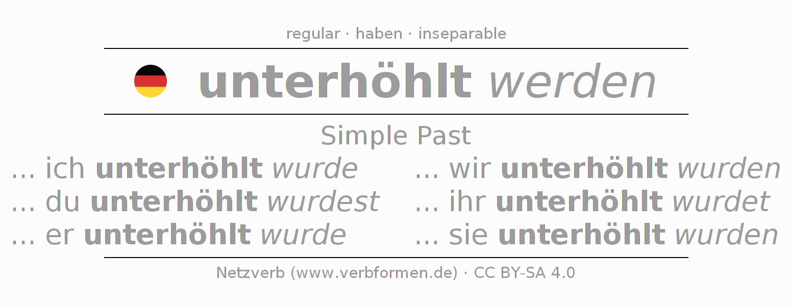 The conjugation of unterhöhlen in Imperfect Indicative Past Passive is ... ich unterhöhlt wurde, ... du unterhöhlt wurdest, ... er unterhöhlt wurde, ... wir unterhöhlt wurden, ... ihr unterhöhlt wurdet, ... sie unterhöhlt wurden.The conjugation corresponds to certain grammatical rules. Likewise the requirements for the conjugation of the simple verb forms of unterhöhlen in Imperfect. Comments ☆