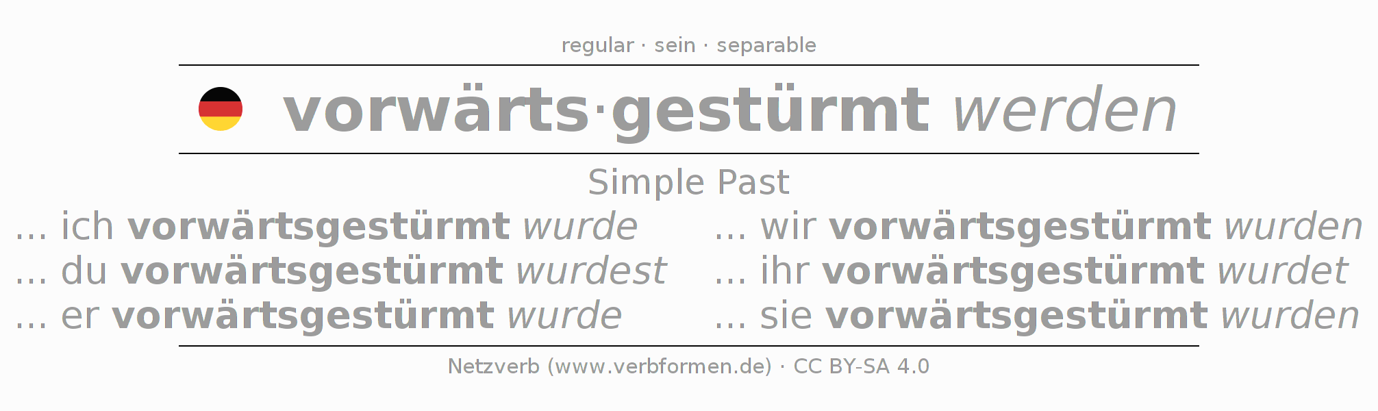 The verb vorwärtsstürmen fully conjugated in all persons and numbers in the Imperfect Indicative