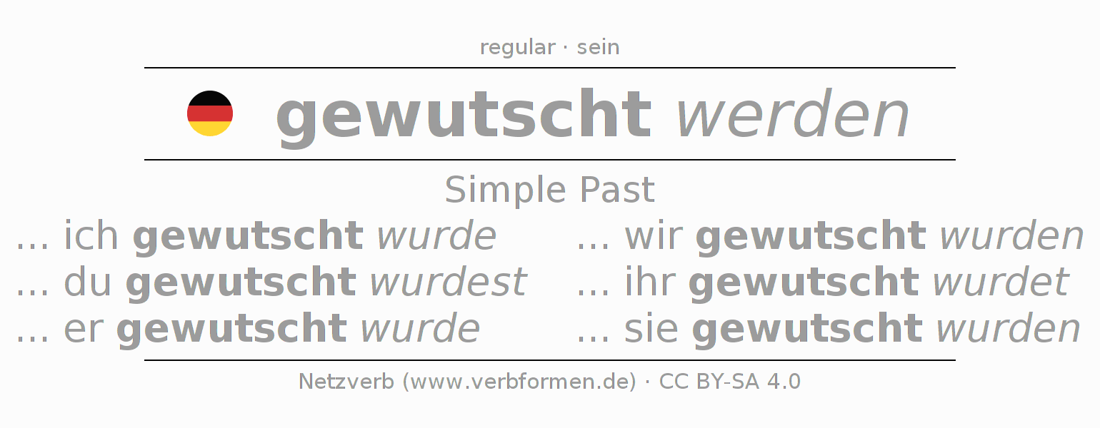 The conjugation of wutschen in Imperfect Indicative Past Passive is ... ich gewutscht wurde, ... du gewutscht wurdest, ... er gewutscht wurde, ... wir gewutscht wurden, ... ihr gewutscht wurdet, ... sie gewutscht wurden.The conjugation corresponds to certain grammatical rules. Likewise the requirements for the conjugation of the simple verb forms of wutschen in Imperfect. Comments ☆
