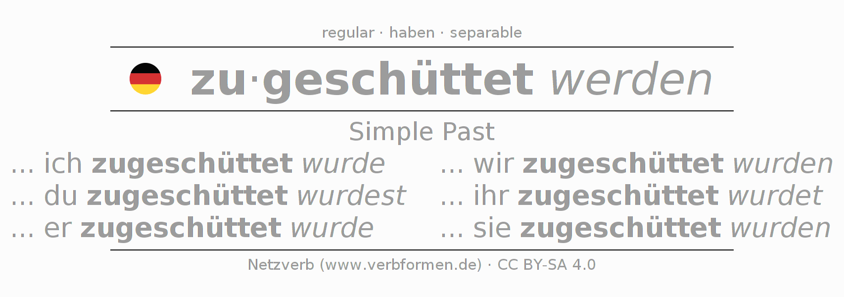 The verb zuschütten fully conjugated in all persons and numbers in the Imperfect Indicative