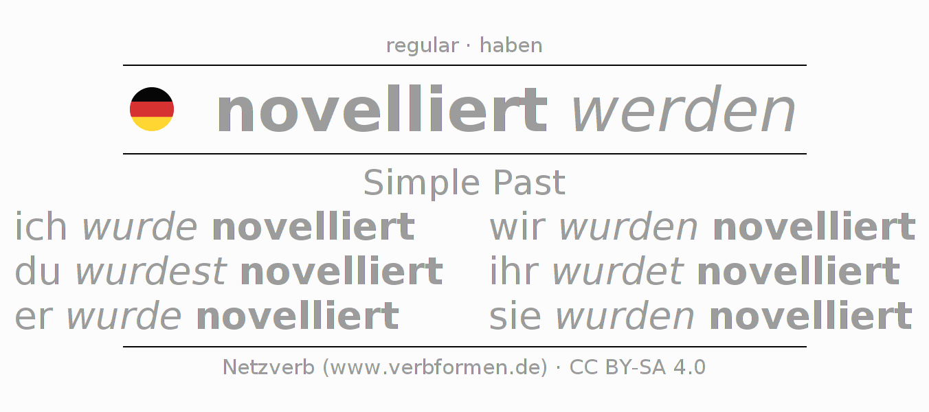 The conjugation of novellieren in Imperfect Indicative Past Passive is ich wurde novelliert, du wurdest novelliert, er wurde novelliert, wir wurden novelliert, ihr wurdet novelliert, sie wurden novelliert.The conjugation corresponds to certain grammatical rules. Likewise the requirements for the conjugation of the simple verb forms of novellieren in Imperfect. Comments ☆