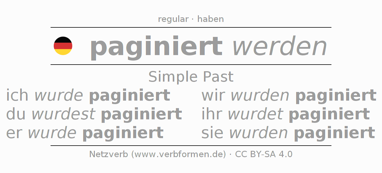 The conjugation of paginieren in Imperfect Indicative Past Passive is ich wurde paginiert, du wurdest paginiert, er wurde paginiert, wir wurden paginiert, ihr wurdet paginiert, sie wurden paginiert.The conjugation corresponds to certain grammatical rules. Likewise the requirements for the conjugation of the simple verb forms of paginieren in Imperfect. Comments ☆
