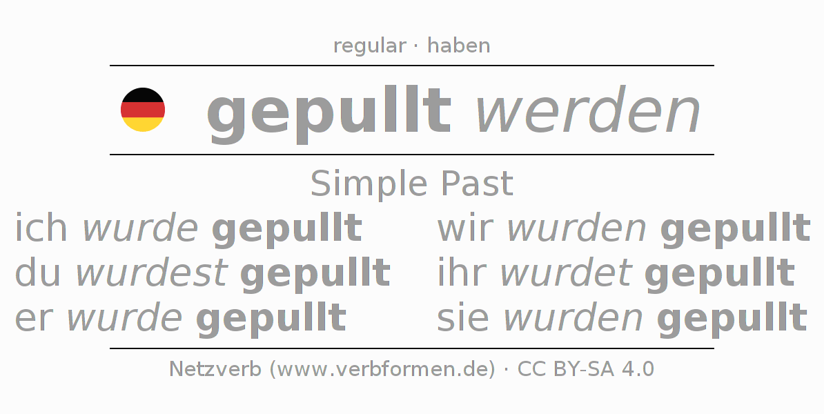 The conjugation of pullen in Imperfect Indicative Past Passive is ich wurde gepullt, du wurdest gepullt, er wurde gepullt, wir wurden gepullt, ihr wurdet gepullt, sie wurden gepullt.The conjugation corresponds to certain grammatical rules. Likewise the requirements for the conjugation of the simple verb forms of pullen in Imperfect. Comments ☆