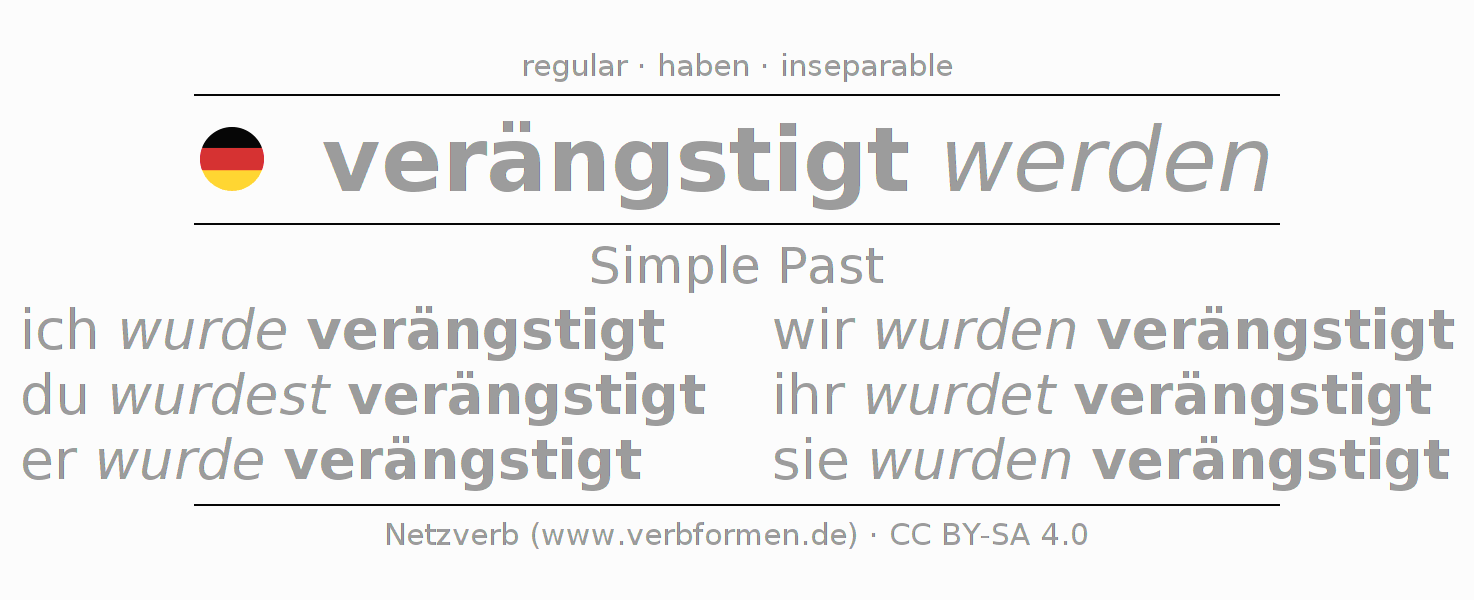The conjugation of verängstigen in Imperfect Indicative Past Passive is ich wurde verängstigt, du wurdest verängstigt, er wurde verängstigt, wir wurden verängstigt, ihr wurdet verängstigt, sie wurden verängstigt.The conjugation corresponds to certain grammatical rules. Likewise the requirements for the conjugation of the simple verb forms of verängstigen in Imperfect. Comments ☆