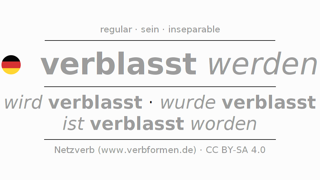 The conjugation of verblassen in Imperfect Indicative Past Passive is ich wurde verblasst, du wurdest verblasst, er wurde verblasst, wir wurden verblasst, ihr wurdet verblasst, sie wurden verblasst.The conjugation corresponds to certain grammatical rules. Likewise the requirements for the conjugation of the simple verb forms of verblassen in Imperfect. Comments ☆