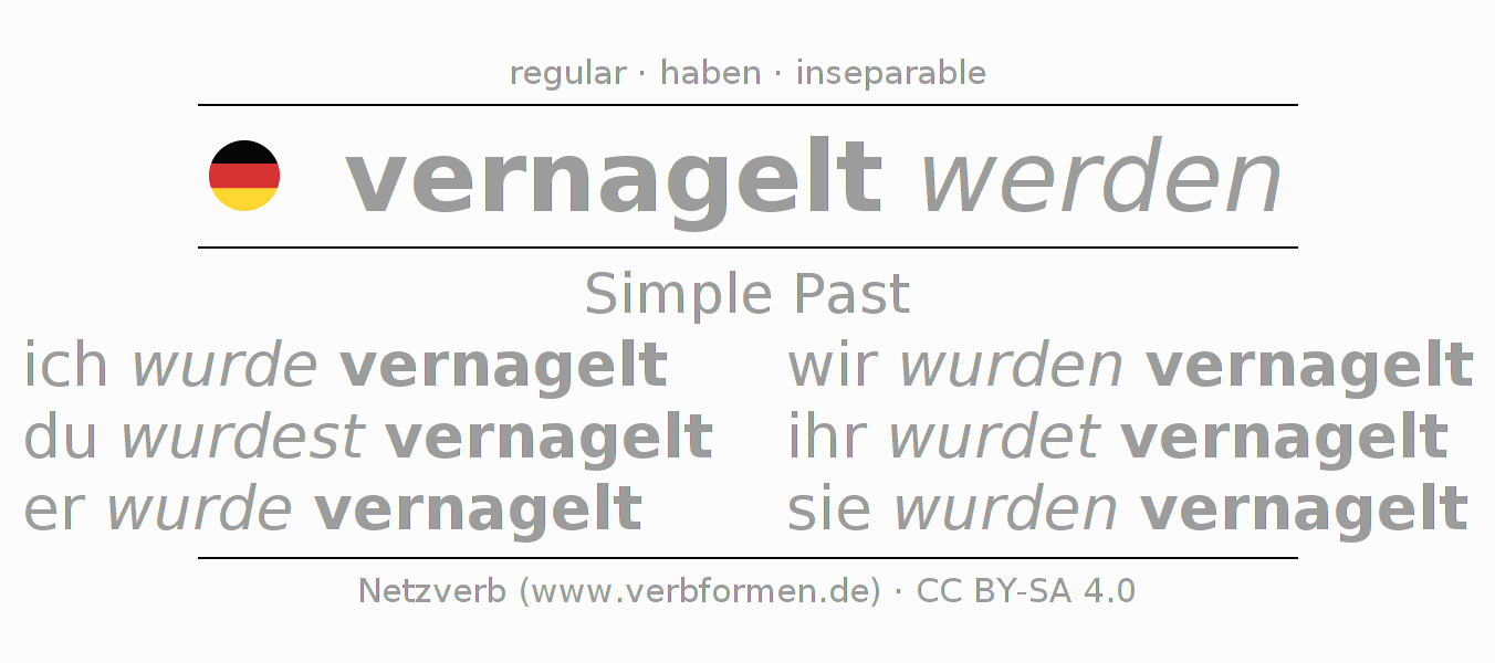 The conjugation of vernageln in Imperfect Indicative Past Passive is ich wurde vernagelt, du wurdest vernagelt, er wurde vernagelt, wir wurden vernagelt, ihr wurdet vernagelt, sie wurden vernagelt.The conjugation corresponds to certain grammatical rules. Likewise the requirements for the conjugation of the simple verb forms of vernageln in Imperfect. Comments ☆