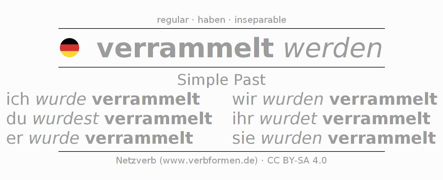 The conjugation of verrammeln in Imperfect Indicative Past Passive is ich wurde verrammelt, du wurdest verrammelt, er wurde verrammelt, wir wurden verrammelt, ihr wurdet verrammelt, sie wurden verrammelt.The conjugation corresponds to certain grammatical rules. Likewise the requirements for the conjugation of the simple verb forms of verrammeln in Imperfect. Comments ☆