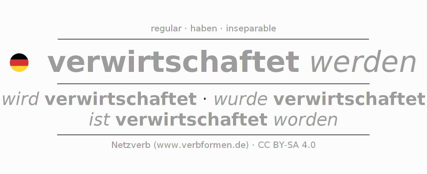 The conjugation of verwirtschaften in Imperfect Indicative Past Passive is ich wurde verwirtschaftet, du wurdest verwirtschaftet, er wurde verwirtschaftet, wir wurden verwirtschaftet, ihr wurdet verwirtschaftet, sie wurden verwirtschaftet.The conjugation corresponds to certain grammatical rules. Likewise the requirements for the conjugation of the simple verb forms of verwirtschaften in Imperfect. Comments ☆