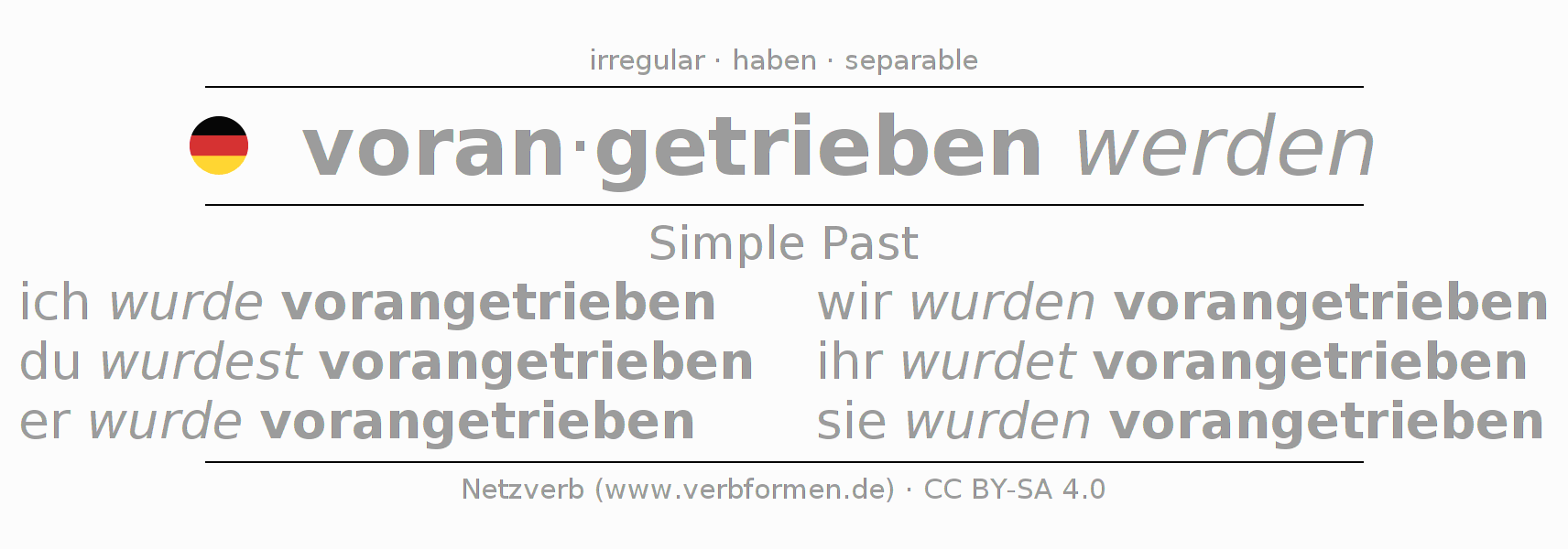 The conjugation of vorantreiben in Imperfect Indicative Past Passive is ich wurde vorangetrieben, du wurdest vorangetrieben, er wurde vorangetrieben, wir wurden vorangetrieben, ihr wurdet vorangetrieben, sie wurden vorangetrieben.The conjugation corresponds to certain grammatical rules. Likewise the requirements for the conjugation of the simple verb forms of vorantreiben in Imperfect. Comments ☆