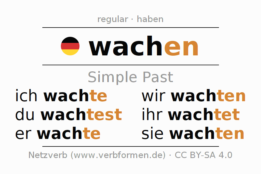 The conjugation of wachen (wake, guard) in the past tense is ich wachte, du wachtest, er wachte, wir wachten, ihr wachtet, sie wachten. As a regular verb the unmodified stem wach- is used. The preterite endings -te, -test, -te, -ten, -tet, -ten are appended to this stem.The conjugation of these forms conforms to the grammatical rules for verbs in the past tense. Comments ☆