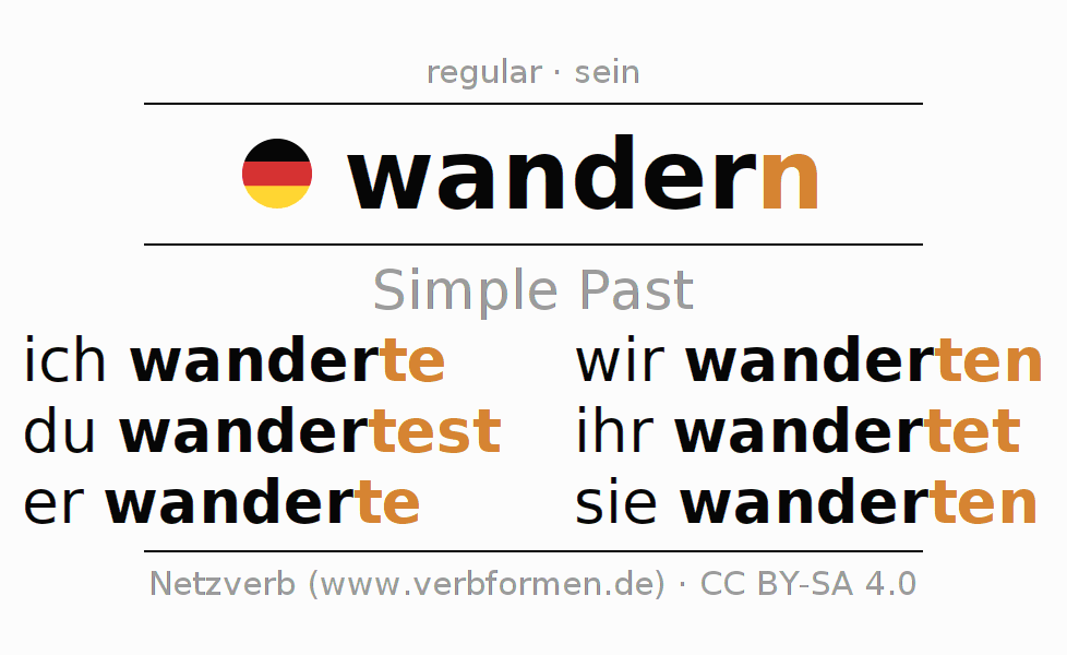 The conjugation of wandern (hike, roam) in the past tense is ich wanderte, du wandertest, er wanderte, wir wanderten, ihr wandertet, sie wanderten. As a regular verb the unmodified stem wander- is used. The preterite endings -te, -test, -te, -ten, -tet, -ten are appended to this stem.The conjugation of these forms conforms to the grammatical rules for verbs in the past tense. Comments ☆
