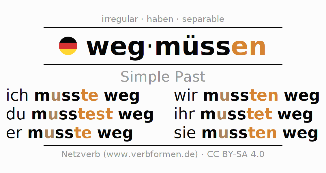 The conjugation of wegmüssen (must go away, have to leave) in the past tense is ich musste weg, du musstest weg, er musste weg, wir mussten weg, ihr musstet weg, sie mussten weg. As an irregular verb is the changed preterite stem muss- used. The preterite endings -te, -test, -te, -ten, -tet, -ten are appended to this stem.The prefix weg- of wegmüssen is separated.The conjugation of these forms conforms to the grammatical rules for verbs in the past tense. Comments ☆