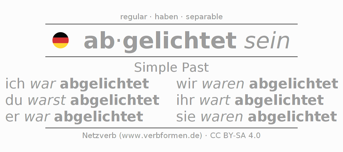 The conjugation of ablichten in Imperfect Indicative Past Statal Passive is ich war abgelichtet, du warst abgelichtet, er war abgelichtet, wir waren abgelichtet, ihr wart abgelichtet, sie waren abgelichtet.The conjugation corresponds to certain grammatical rules. Likewise the requirements for the conjugation of the simple verb forms of ablichten in Imperfect. Comments ☆