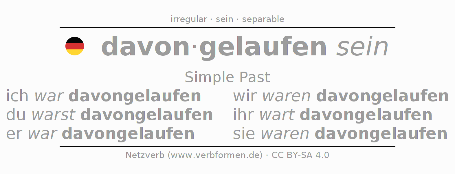 The conjugation of davonlaufen in Imperfect Indicative Past Statal Passive is ich war davongelaufen, du warst davongelaufen, er war davongelaufen, wir waren davongelaufen, ihr wart davongelaufen, sie waren davongelaufen.The conjugation corresponds to certain grammatical rules. Likewise the requirements for the conjugation of the simple verb forms of davonlaufen in Imperfect. Comments ☆