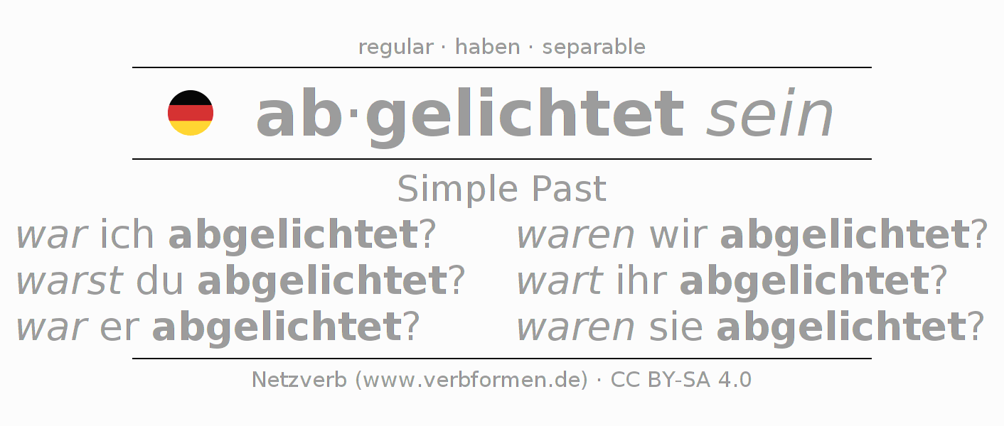 The conjugation of ablichten in Imperfect Indicative Past Statal Passive is war ich abgelichtet?, warst du abgelichtet?, war er abgelichtet?, waren wir abgelichtet?, wart ihr abgelichtet?, waren sie abgelichtet?.The conjugation corresponds to certain grammatical rules. Likewise the requirements for the conjugation of the simple verb forms of ablichten in Imperfect. Comments ☆