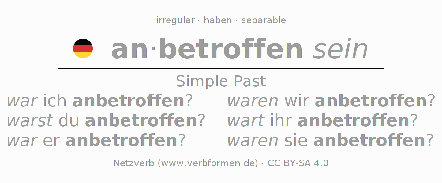 The conjugation of anbetreffen in Imperfect Indicative Past Statal Passive is war ich anbetroffen?, warst du anbetroffen?, war er anbetroffen?, waren wir anbetroffen?, wart ihr anbetroffen?, waren sie anbetroffen?.The conjugation corresponds to certain grammatical rules. Likewise the requirements for the conjugation of the simple verb forms of anbetreffen in Imperfect. Comments ☆