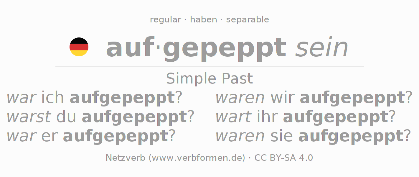 The conjugation of aufpeppen in Imperfect Indicative Past Statal Passive is war ich aufgepeppt?, warst du aufgepeppt?, war er aufgepeppt?, waren wir aufgepeppt?, wart ihr aufgepeppt?, waren sie aufgepeppt?.The conjugation corresponds to certain grammatical rules. Likewise the requirements for the conjugation of the simple verb forms of aufpeppen in Imperfect. Comments ☆