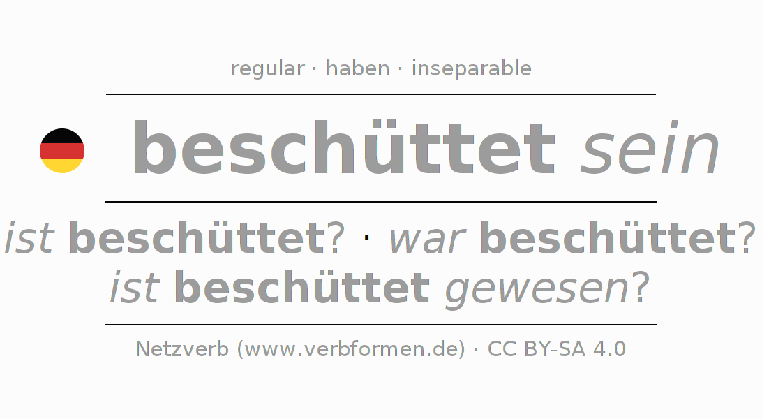 The conjugation of beschütten in Imperfect Indicative Past Statal Passive is war ich beschüttet?, warst du beschüttet?, war er beschüttet?, waren wir beschüttet?, wart ihr beschüttet?, waren sie beschüttet?.The conjugation corresponds to certain grammatical rules. Likewise the requirements for the conjugation of the simple verb forms of beschütten in Imperfect. Comments ☆