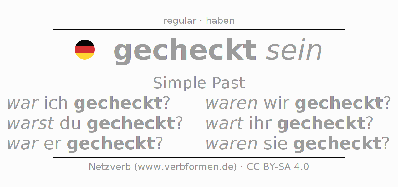 The conjugation of checken in Imperfect Indicative Past Statal Passive is war ich gecheckt?, warst du gecheckt?, war er gecheckt?, waren wir gecheckt?, wart ihr gecheckt?, waren sie gecheckt?.The conjugation corresponds to certain grammatical rules. Likewise the requirements for the conjugation of the simple verb forms of checken in Imperfect. Comments ☆