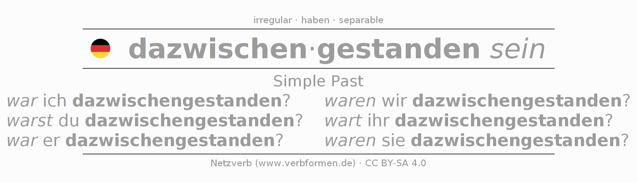 The verb dazwischenstehen (hat) fully conjugated in all persons and numbers in the Imperfect Indicative