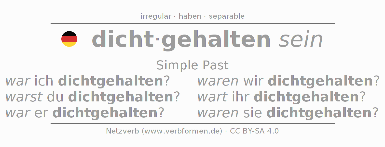 The conjugation of dichthalten in Imperfect Indicative Past Statal Passive is war ich dichtgehalten?, warst du dichtgehalten?, war er dichtgehalten?, waren wir dichtgehalten?, wart ihr dichtgehalten?, waren sie dichtgehalten?.The conjugation corresponds to certain grammatical rules. Likewise the requirements for the conjugation of the simple verb forms of dichthalten in Imperfect. Comments ☆