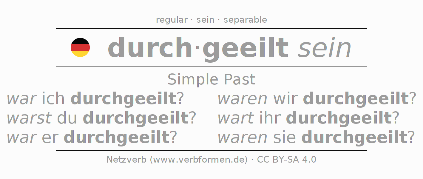 The conjugation of durcheilen in Imperfect Indicative Past Statal Passive is war ich durchgeeilt?, warst du durchgeeilt?, war er durchgeeilt?, waren wir durchgeeilt?, wart ihr durchgeeilt?, waren sie durchgeeilt?.The conjugation corresponds to certain grammatical rules. Likewise the requirements for the conjugation of the simple verb forms of durcheilen in Imperfect. Comments ☆