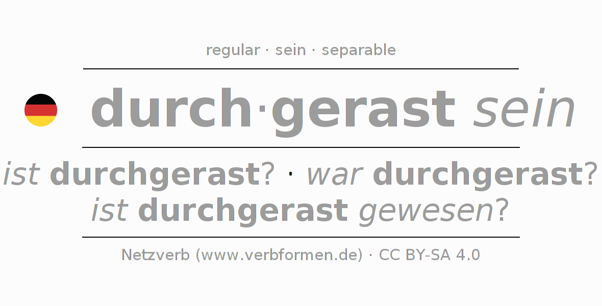 The conjugation of durchrasen in Imperfect Indicative Past Statal Passive is war ich durchgerast?, warst du durchgerast?, war er durchgerast?, waren wir durchgerast?, wart ihr durchgerast?, waren sie durchgerast?.The conjugation corresponds to certain grammatical rules. Likewise the requirements for the conjugation of the simple verb forms of durchrasen in Imperfect. Comments ☆