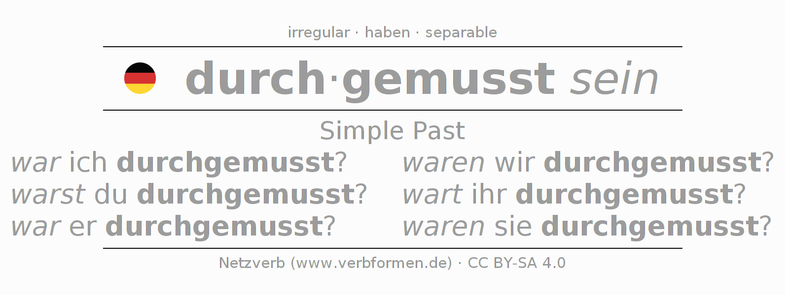 The conjugation of durchmüssen in Imperfect Indicative Past Statal Passive is war ich durchgemusst?, warst du durchgemusst?, war er durchgemusst?, waren wir durchgemusst?, wart ihr durchgemusst?, waren sie durchgemusst?.The conjugation corresponds to certain grammatical rules. Likewise the requirements for the conjugation of the simple verb forms of durchmüssen in Imperfect. Comments ☆