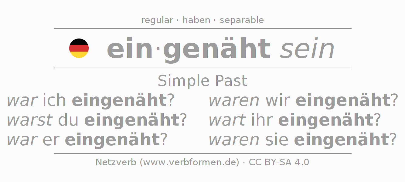 The conjugation of einnähen in Imperfect Indicative Past Statal Passive is war ich eingenäht?, warst du eingenäht?, war er eingenäht?, waren wir eingenäht?, wart ihr eingenäht?, waren sie eingenäht?.The conjugation corresponds to certain grammatical rules. Likewise the requirements for the conjugation of the simple verb forms of einnähen in Imperfect. Comments ☆