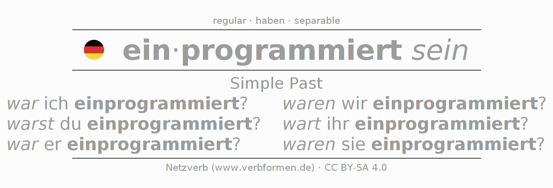 The verb einprogrammieren fully conjugated in all persons and numbers in the Imperfect Indicative