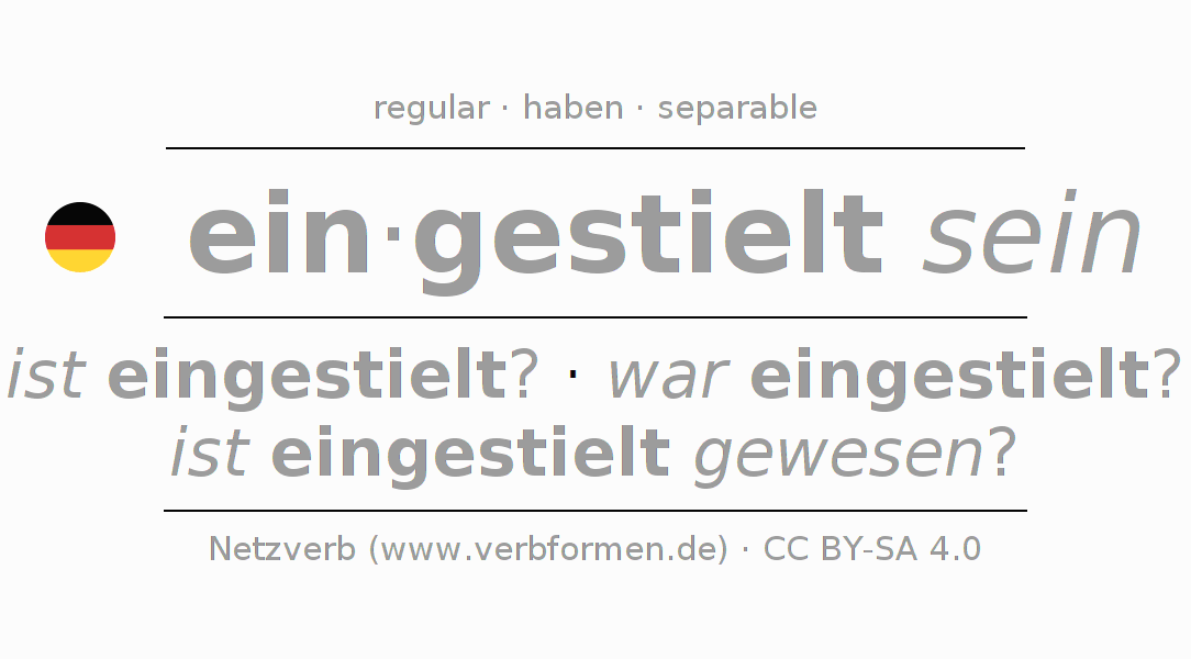 The conjugation of einstielen in Imperfect Indicative Past Statal Passive is war ich eingestielt?, warst du eingestielt?, war er eingestielt?, waren wir eingestielt?, wart ihr eingestielt?, waren sie eingestielt?.The conjugation corresponds to certain grammatical rules. Likewise the requirements for the conjugation of the simple verb forms of einstielen in Imperfect. Comments ☆