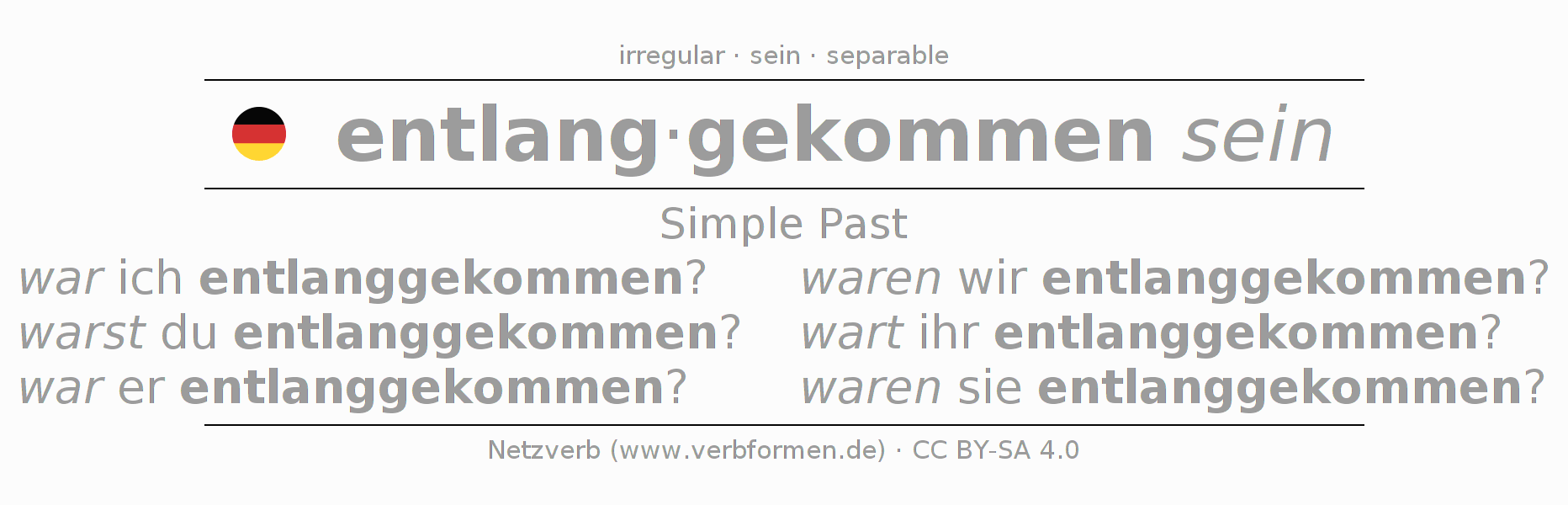 The conjugation of entlangkommen in Imperfect Indicative Past Statal Passive is war ich entlanggekommen?, warst du entlanggekommen?, war er entlanggekommen?, waren wir entlanggekommen?, wart ihr entlanggekommen?, waren sie entlanggekommen?.The conjugation corresponds to certain grammatical rules. Likewise the requirements for the conjugation of the simple verb forms of entlangkommen in Imperfect. Comments ☆