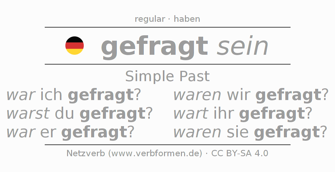 The conjugation of fragen in Imperfect Indicative Past Statal Passive is war ich gefragt?, warst du gefragt?, war er gefragt?, waren wir gefragt?, wart ihr gefragt?, waren sie gefragt?.The conjugation corresponds to certain grammatical rules. Likewise the requirements for the conjugation of the simple verb forms of fragen in Imperfect. Comments ☆