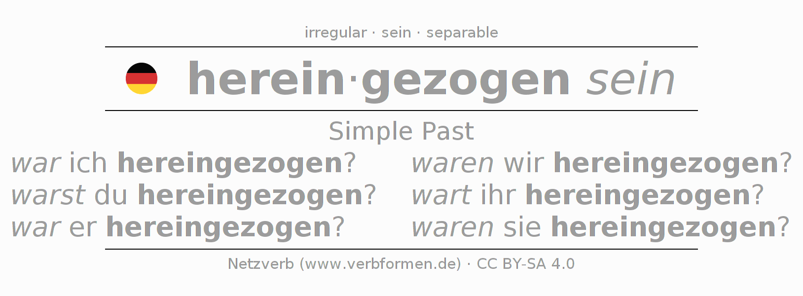 The conjugation of hereinziehen in Imperfect Indicative Past Statal Passive is war ich hereingezogen?, warst du hereingezogen?, war er hereingezogen?, waren wir hereingezogen?, wart ihr hereingezogen?, waren sie hereingezogen?.The conjugation corresponds to certain grammatical rules. Likewise the requirements for the conjugation of the simple verb forms of hereinziehen in Imperfect. Comments ☆