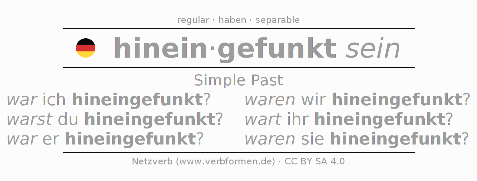 The conjugation of hineinfunken in Imperfect Indicative Past Statal Passive is war ich hineingefunkt?, warst du hineingefunkt?, war er hineingefunkt?, waren wir hineingefunkt?, wart ihr hineingefunkt?, waren sie hineingefunkt?.The conjugation corresponds to certain grammatical rules. Likewise the requirements for the conjugation of the simple verb forms of hineinfunken in Imperfect. Comments ☆