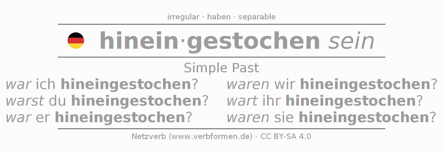 The conjugation of hineinstechen in Imperfect Indicative Past Statal Passive is war ich hineingestochen?, warst du hineingestochen?, war er hineingestochen?, waren wir hineingestochen?, wart ihr hineingestochen?, waren sie hineingestochen?.The conjugation corresponds to certain grammatical rules. Likewise the requirements for the conjugation of the simple verb forms of hineinstechen in Imperfect. Comments ☆