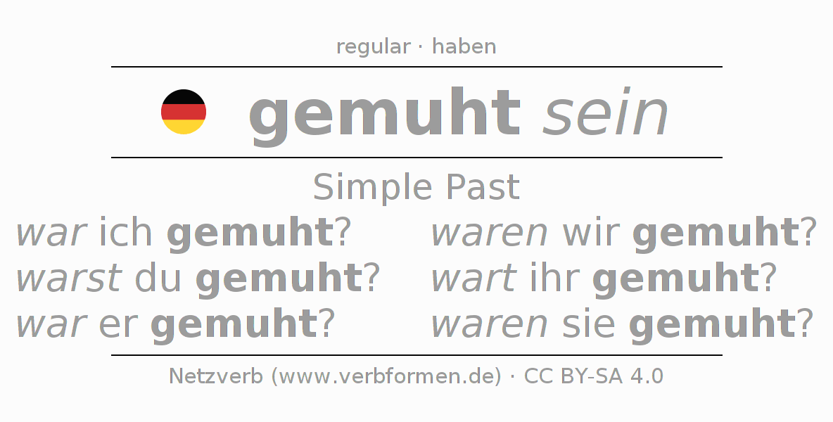 The conjugation of muhen in Imperfect Indicative Past Statal Passive is war ich gemuht?, warst du gemuht?, war er gemuht?, waren wir gemuht?, wart ihr gemuht?, waren sie gemuht?.The conjugation corresponds to certain grammatical rules. Likewise the requirements for the conjugation of the simple verb forms of muhen in Imperfect. Comments ☆