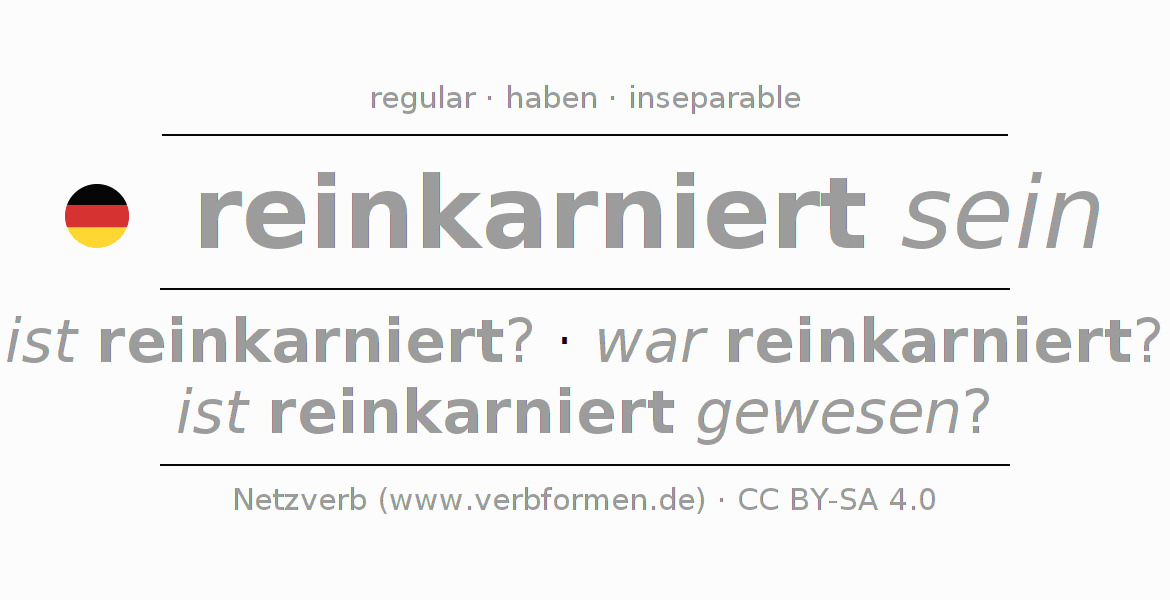 The conjugation of reinkarnieren in Imperfect Indicative Past Statal Passive is war ich reinkarniert?, warst du reinkarniert?, war er reinkarniert?, waren wir reinkarniert?, wart ihr reinkarniert?, waren sie reinkarniert?.The conjugation corresponds to certain grammatical rules. Likewise the requirements for the conjugation of the simple verb forms of reinkarnieren in Imperfect. Comments ☆