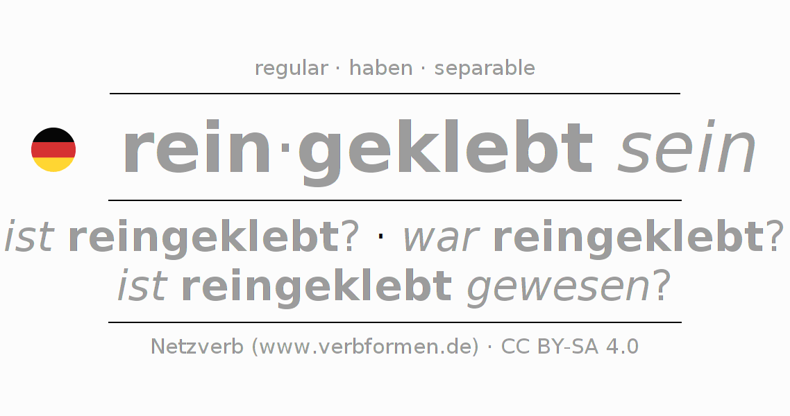 The conjugation of reinkleben in Imperfect Indicative Past Statal Passive is war ich reingeklebt?, warst du reingeklebt?, war er reingeklebt?, waren wir reingeklebt?, wart ihr reingeklebt?, waren sie reingeklebt?.The conjugation corresponds to certain grammatical rules. Likewise the requirements for the conjugation of the simple verb forms of reinkleben in Imperfect. Comments ☆