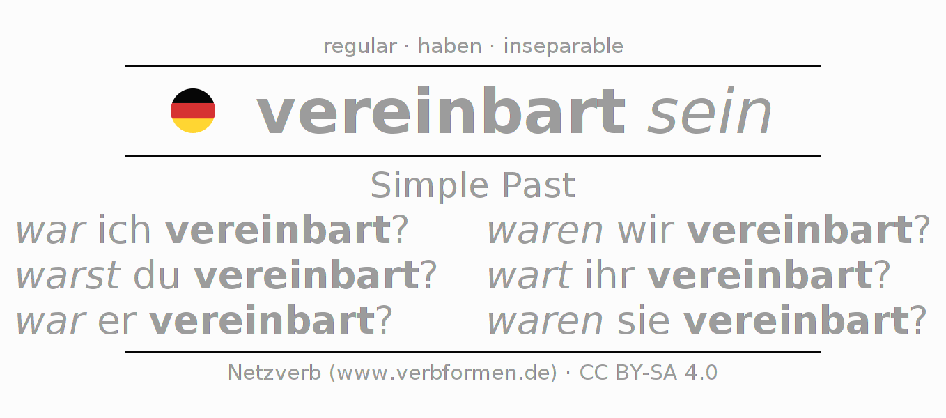The conjugation of vereinbaren in Imperfect Indicative Past Statal Passive is war ich vereinbart?, warst du vereinbart?, war er vereinbart?, waren wir vereinbart?, wart ihr vereinbart?, waren sie vereinbart?.The conjugation corresponds to certain grammatical rules. Likewise the requirements for the conjugation of the simple verb forms of vereinbaren in Imperfect. Comments ☆