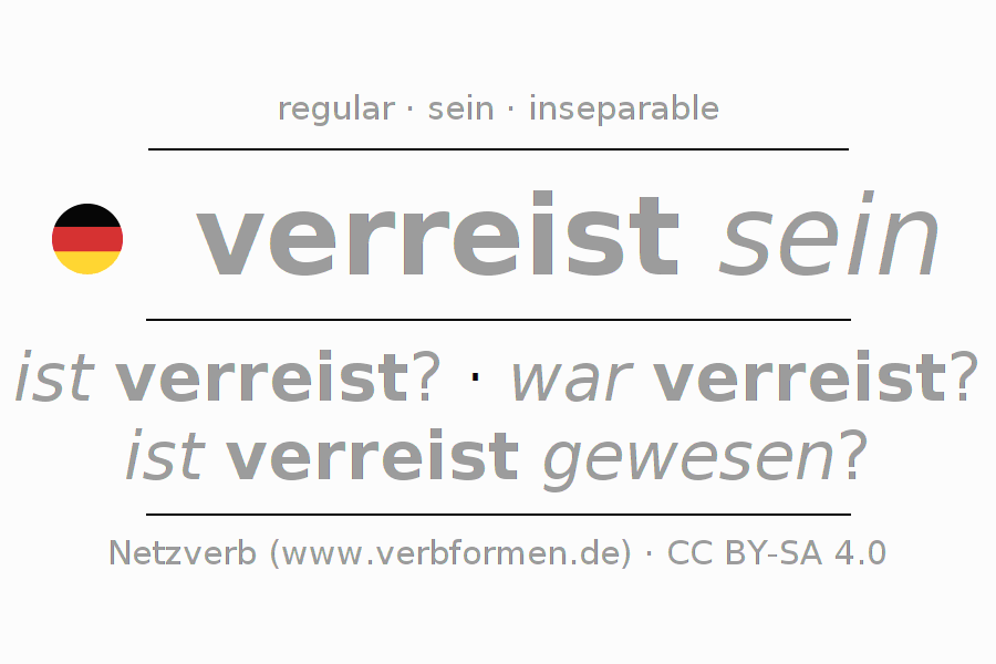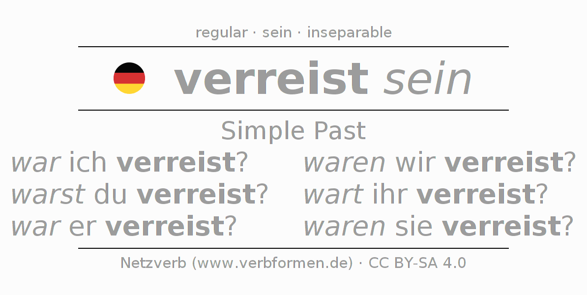 The conjugation of verreisen in Imperfect Indicative Past Statal Passive is war ich verreist?, warst du verreist?, war er verreist?, waren wir verreist?, wart ihr verreist?, waren sie verreist?.The conjugation corresponds to certain grammatical rules. Likewise the requirements for the conjugation of the simple verb forms of verreisen in Imperfect. Comments ☆