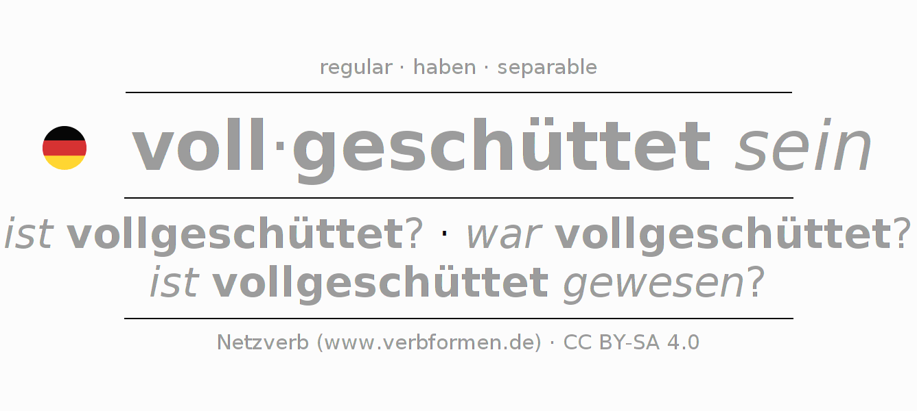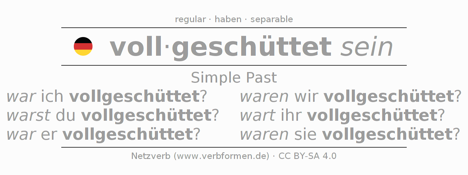 The conjugation of vollschütten in Imperfect Indicative Past Statal Passive is war ich vollgeschüttet?, warst du vollgeschüttet?, war er vollgeschüttet?, waren wir vollgeschüttet?, wart ihr vollgeschüttet?, waren sie vollgeschüttet?.The conjugation corresponds to certain grammatical rules. Likewise the requirements for the conjugation of the simple verb forms of vollschütten in Imperfect. Comments ☆