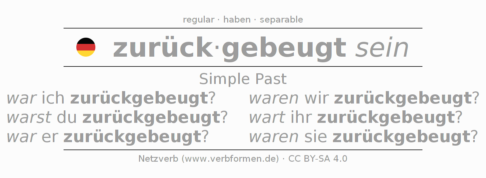 The conjugation of zurückbeugen in Imperfect Indicative Past Statal Passive is war ich zurückgebeugt?, warst du zurückgebeugt?, war er zurückgebeugt?, waren wir zurückgebeugt?, wart ihr zurückgebeugt?, waren sie zurückgebeugt?.The conjugation corresponds to certain grammatical rules. Likewise the requirements for the conjugation of the simple verb forms of zurückbeugen in Imperfect. Comments ☆