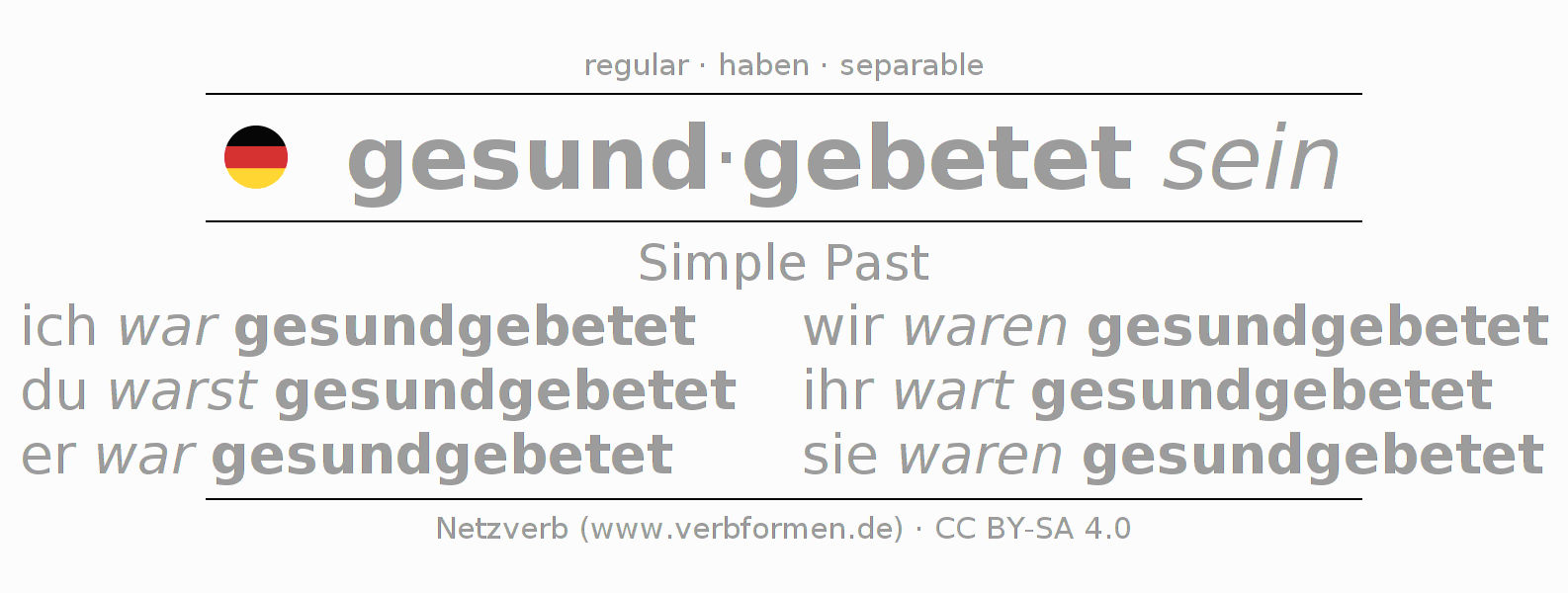 The conjugation of gesundbeten in Imperfect Indicative Past Statal Passive is ich war gesundgebetet, du warst gesundgebetet, er war gesundgebetet, wir waren gesundgebetet, ihr wart gesundgebetet, sie waren gesundgebetet.The conjugation corresponds to certain grammatical rules. Likewise the requirements for the conjugation of the simple verb forms of gesundbeten in Imperfect. Comments ☆