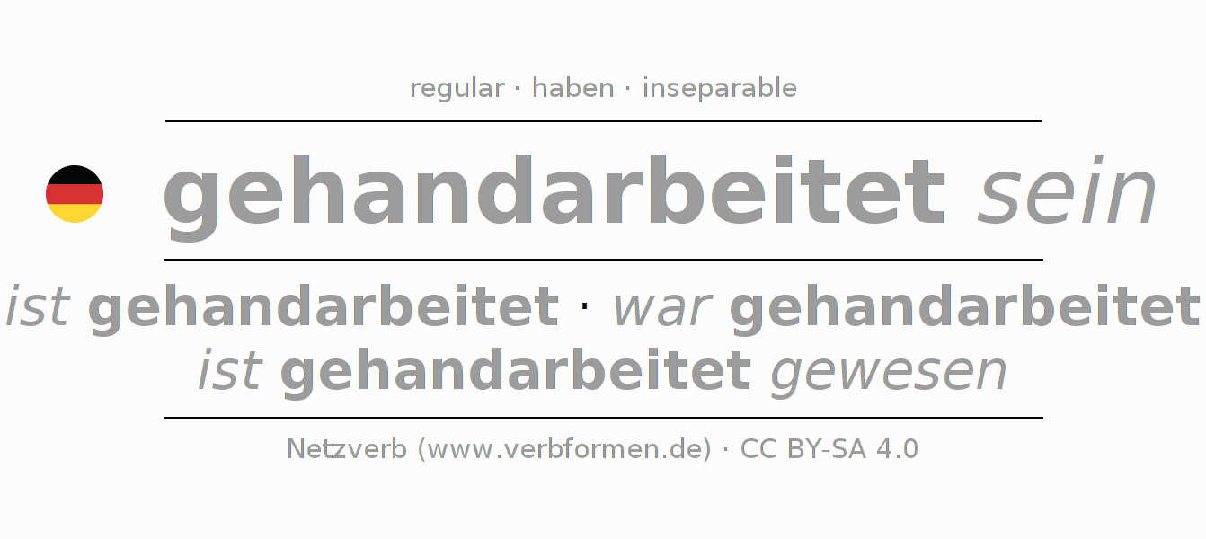 The conjugation of handarbeiten in Imperfect Indicative Past Statal Passive is ich war gehandarbeitet, du warst gehandarbeitet, er war gehandarbeitet, wir waren gehandarbeitet, ihr wart gehandarbeitet, sie waren gehandarbeitet.The conjugation corresponds to certain grammatical rules. Likewise the requirements for the conjugation of the simple verb forms of handarbeiten in Imperfect. Comments ☆