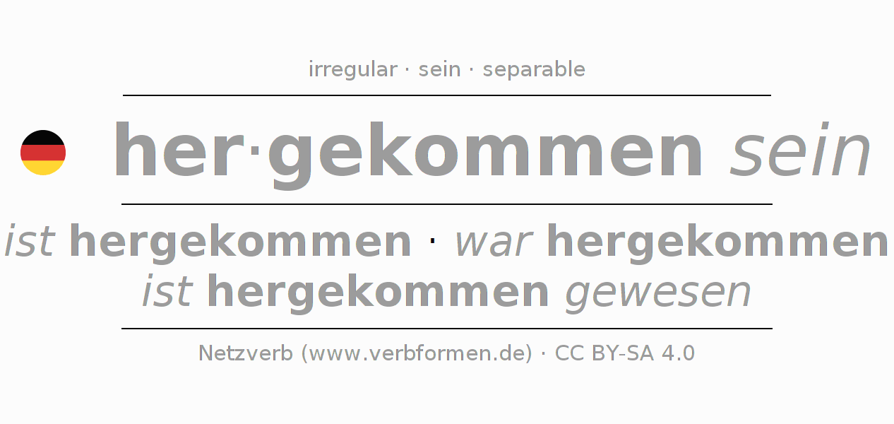 The conjugation of herkommen in Imperfect Indicative Past Statal Passive is ich war hergekommen, du warst hergekommen, er war hergekommen, wir waren hergekommen, ihr wart hergekommen, sie waren hergekommen.The conjugation corresponds to certain grammatical rules. Likewise the requirements for the conjugation of the simple verb forms of herkommen in Imperfect. Comments ☆
