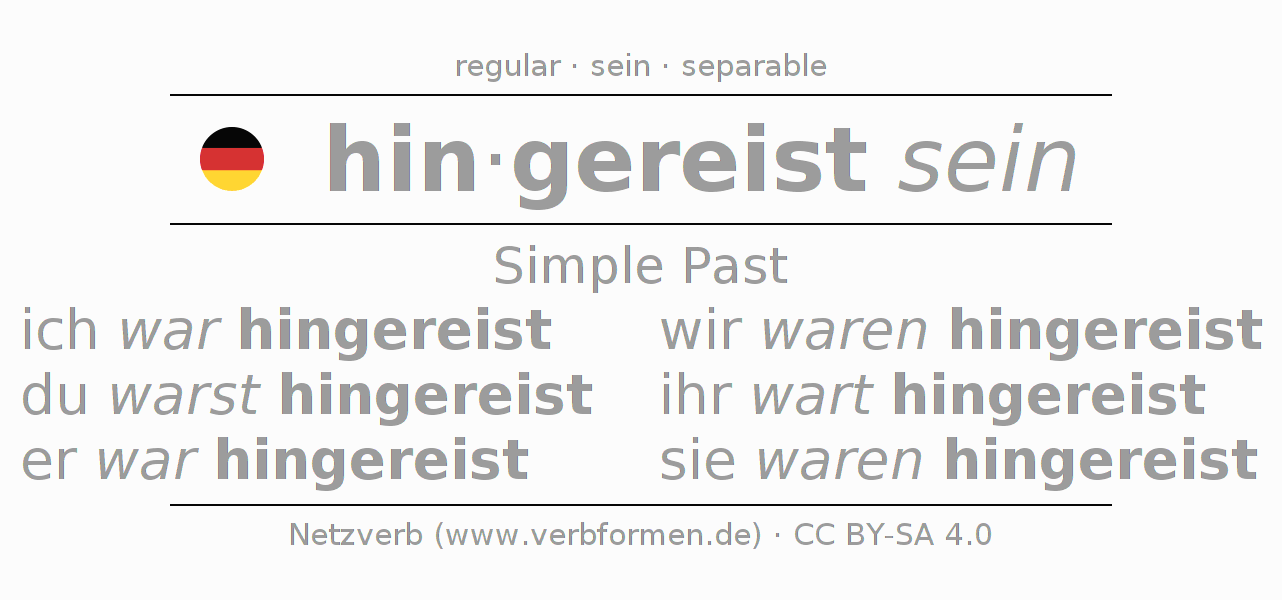 The conjugation of hinreisen in Imperfect Indicative Past Statal Passive is ich war hingereist, du warst hingereist, er war hingereist, wir waren hingereist, ihr wart hingereist, sie waren hingereist.The conjugation corresponds to certain grammatical rules. Likewise the requirements for the conjugation of the simple verb forms of hinreisen in Imperfect. Comments ☆