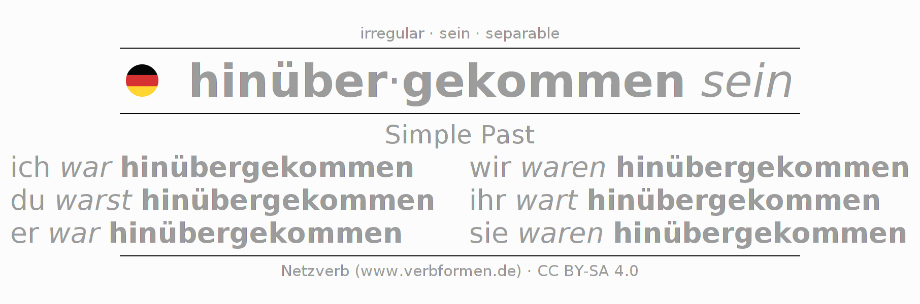 The conjugation of hinüberkommen in Imperfect Indicative Past Statal Passive is ich war hinübergekommen, du warst hinübergekommen, er war hinübergekommen, wir waren hinübergekommen, ihr wart hinübergekommen, sie waren hinübergekommen.The conjugation corresponds to certain grammatical rules. Likewise the requirements for the conjugation of the simple verb forms of hinüberkommen in Imperfect. Comments ☆