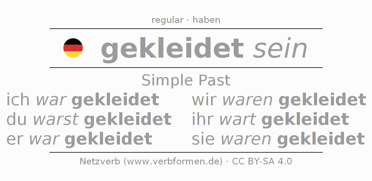 The conjugation of kleiden in Imperfect Indicative Past Statal Passive is ich war gekleidet, du warst gekleidet, er war gekleidet, wir waren gekleidet, ihr wart gekleidet, sie waren gekleidet.The conjugation corresponds to certain grammatical rules. Likewise the requirements for the conjugation of the simple verb forms of kleiden in Imperfect. Comments ☆