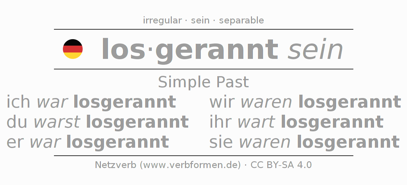 The conjugation of losrennen in Imperfect Indicative Past Statal Passive is ich war losgerannt, du warst losgerannt, er war losgerannt, wir waren losgerannt, ihr wart losgerannt, sie waren losgerannt.The conjugation corresponds to certain grammatical rules. Likewise the requirements for the conjugation of the simple verb forms of losrennen in Imperfect. Comments ☆